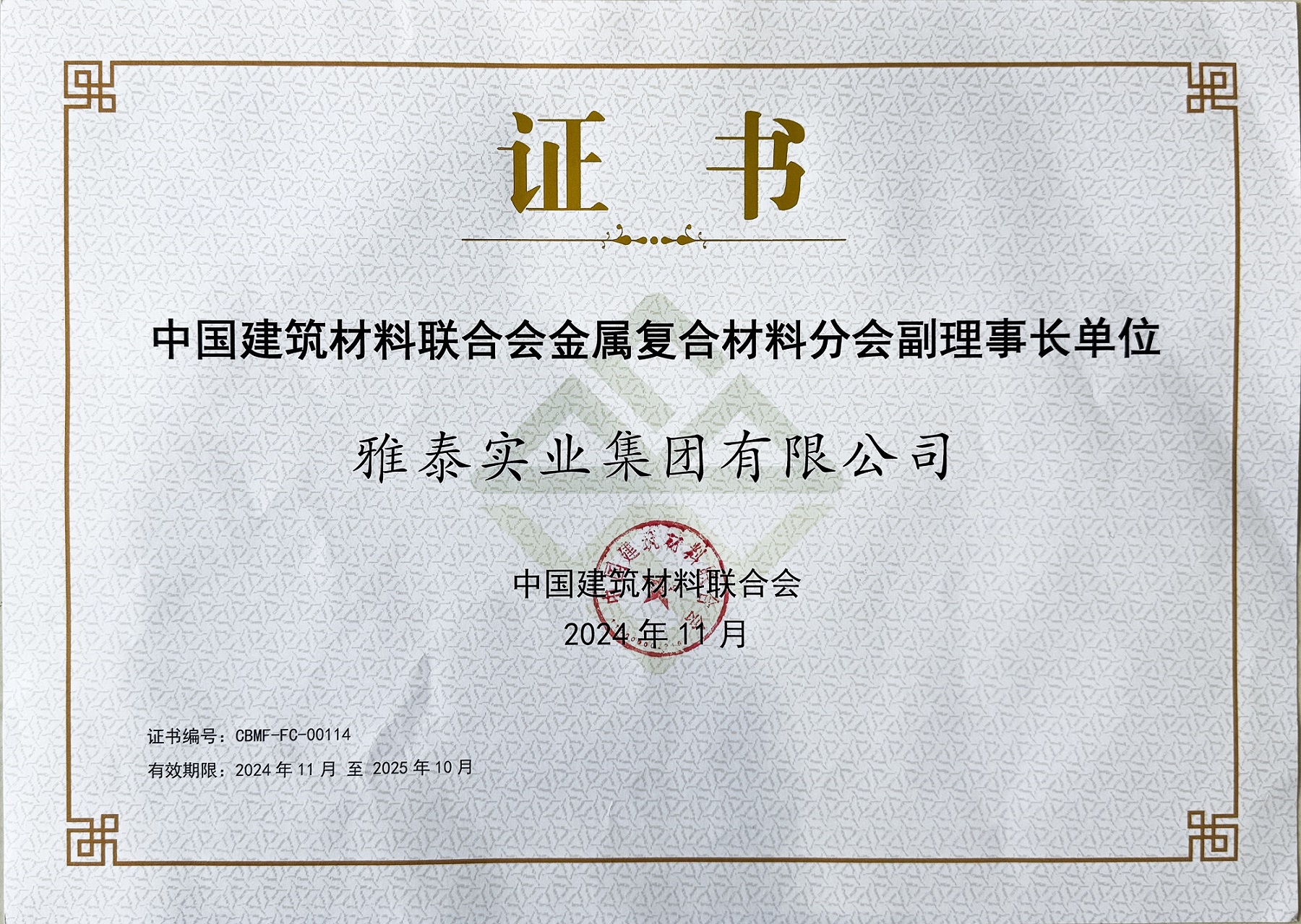 同時(shí),雅泰實(shí)業(yè)集團(tuán)作為幕墻行業(yè)優(yōu)秀的國(guó)內(nèi)老字號(hào)品牌,也長(zhǎng)年擔(dān)任著中國(guó)建筑材料聯(lián)合會(huì)理事、金屬?gòu)?fù)合材料分會(huì)副理事長(zhǎng)等角色。